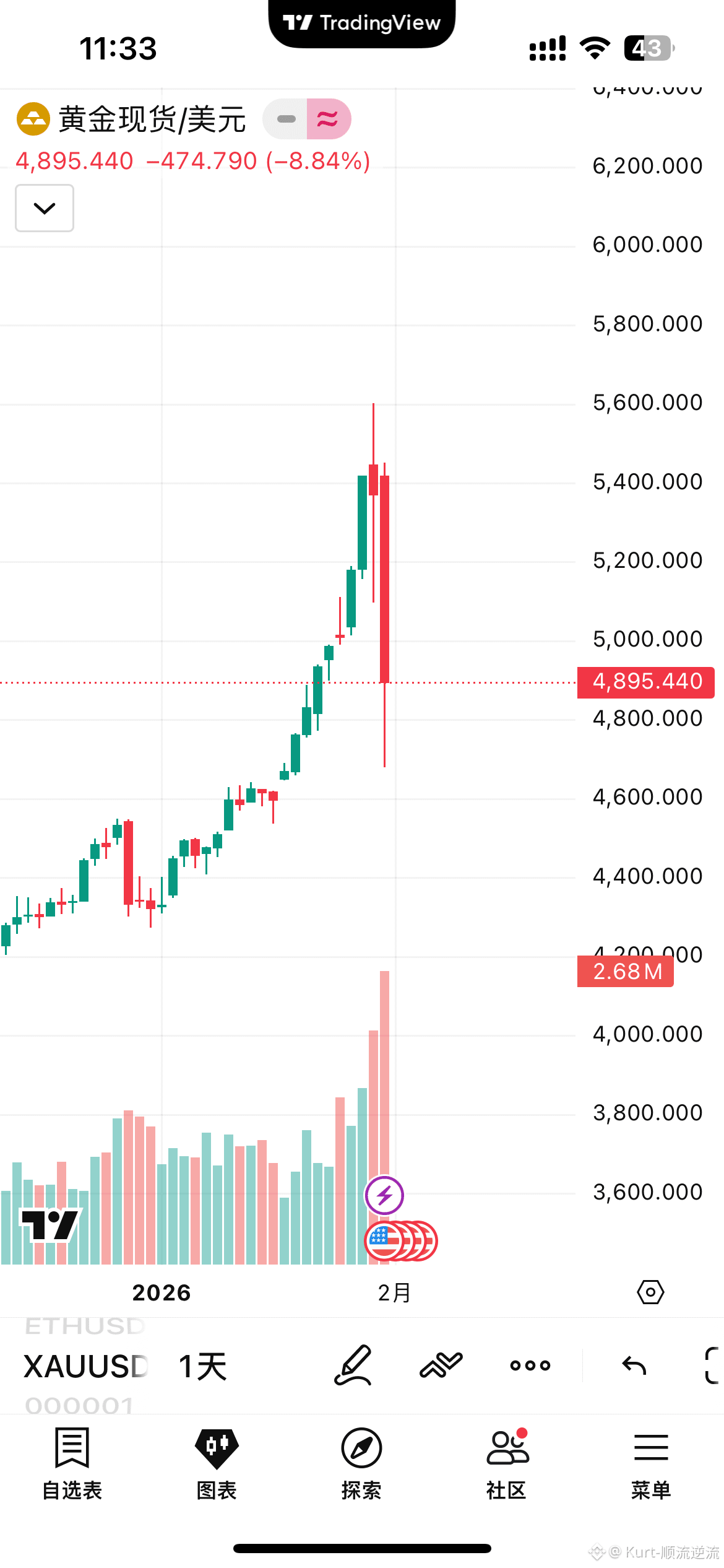#dusk $DUSK @Dusk 昨天(2026年1月30日),黄金市场发生剧烈震荡,简直像极了加密货币中的meme币。黄金作为全球公认的避险资产、价值储存工具,长期以来被投资者视为“稳如泰山”的选择。然而,在短短一天内,现货黄金价格暴跌约9%,期货黄金下跌高达11.4%,从近期触及的5500-5600美元/盎司高点,快速回落至约4745-4895美元/盎司区间。白银表现更惨,单日暴跌30%以上,创下1980年以来最差单日表现,一遍血流成河,我身边外汇圈子做多XAUUSD的朋友,缩水极其严重。