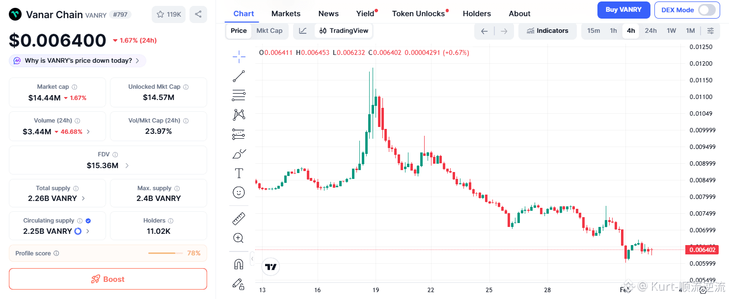当前VANRY面临多重压力。首先是整体crypto市场低迷,2025-2026年初比特币等主链波动带动小币种承压。其次,Vanar虽有AI叙事,但早期产品如myNeutron仍处于beta或有限访问阶段,真实on-chain采用率不高,导致交易量和gas使用未充分释放价值。价格数据显示,VANRY最近在0.006-0.008美元区间震荡,24h交易量数百万美元,市值仅约1400-1600万美元,流通供应约22亿枚,总供应上限约24亿枚。这种低市值伴随高波动,让许多持币者感到焦虑——投机驱动为主,缺乏持续utility需求支撑。
