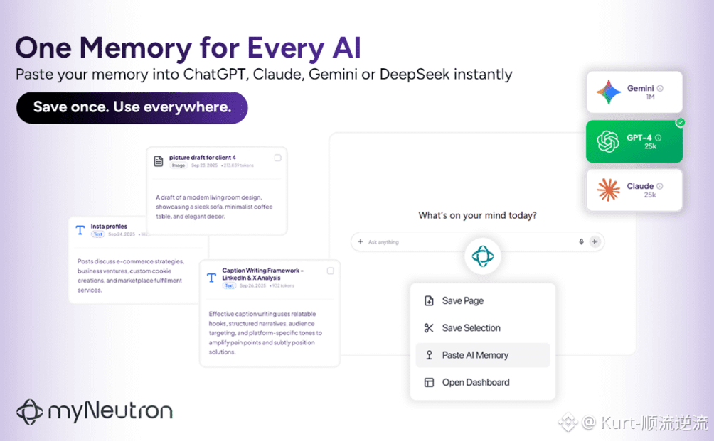 myNeutron这个工具是目前最好的证明。 它能把你的文件、聊天记录、研究笔记压缩成Seeds永久存链上,并且能在ChatGPT、Claude、Gemini这些不同模型间复用记忆,彻底解决了AI“每次对话都失忆”的痛点。