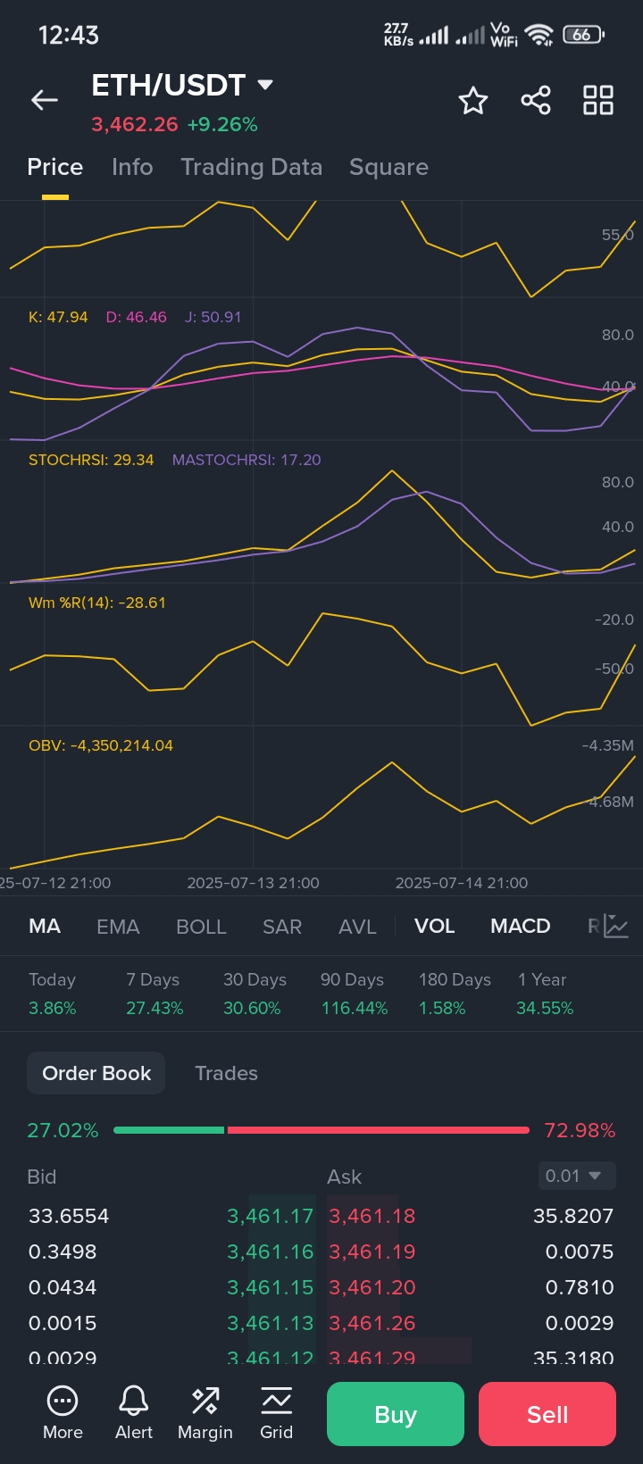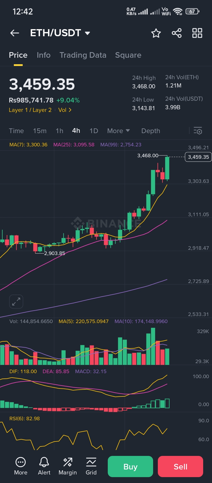 Ethereum (ETH/USDT) robi fale, obecnie handlując w okolicach $3,462, co oznacza imponujący wzrost o +9.26% w ciągu ostatnich 24 godzin! Ten znaczący wzrost przyniósł zarówno ekscytację, jak i zmienność na rynku. Zanużmy się w technikalia i fundamenty, aby zobaczyć, co dalej z drugą co do wielkości kryptowalutą.