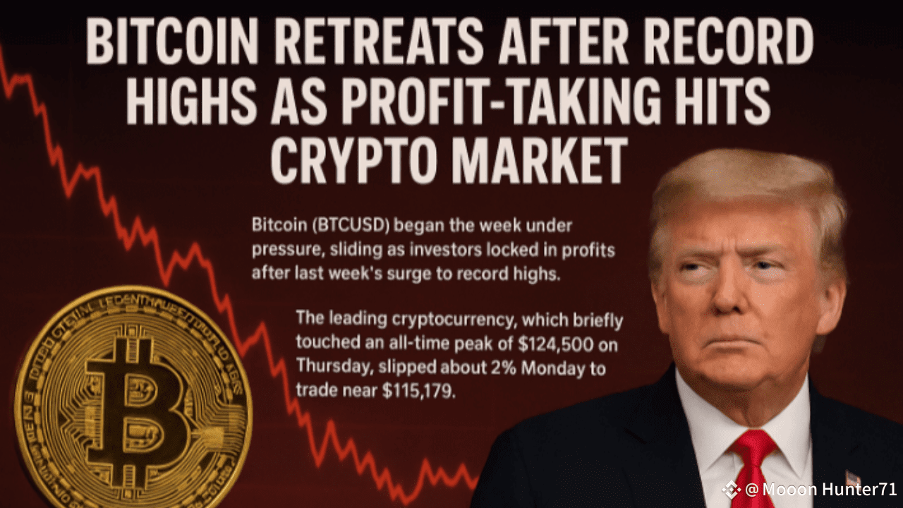 Wiodąca kryptowaluta, która przez chwilę dotknęła rekordowego poziomu 124 500 USD w czwartek, spadła o około 2% w poniedziałek, handlując w pobliżu 115 179 USD. Szerszy rynek poszedł w jej ślady, a Ether (#ETH ) spadł o 3% do około 4 335 USD, podczas gdy #XRP spadł o około 4%.