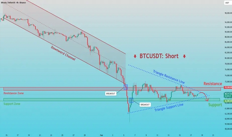 Jednakże, jeśli BTC zdoła przełamać opór trójkąta i odzyska poziom 70,200 z silną akceptacją, osłabi to niedźwiedzi widok i zasugeruje szerszą fazę odbicia lub ekspansję zakresu ku górze. Na razie struktura trendu, pozycjonowanie oporu i kompresja cenowa nadal sprzyjają sprzedawcom, podczas gdy rynek pozostaje poniżej kluczowego oporu.