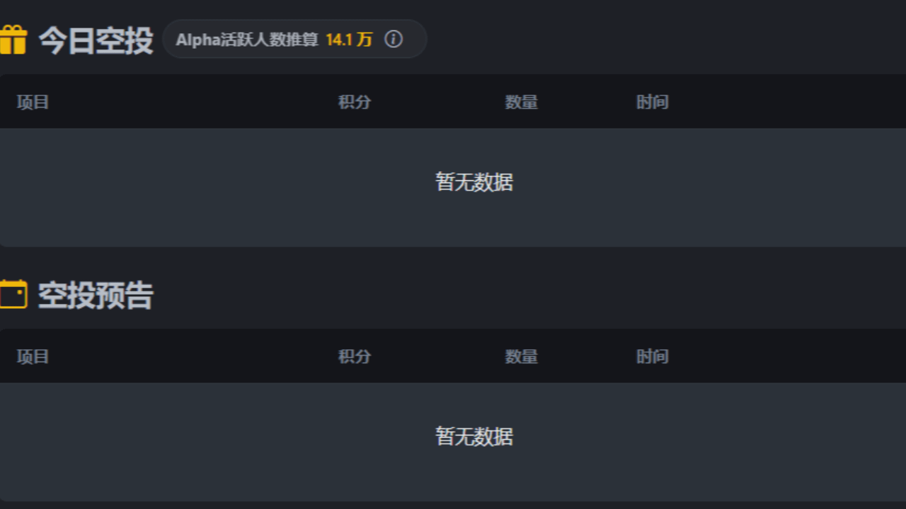 打开Alpha专区,倒计时直接摆烂,显示“无即将上线项目”。平时挤破头的Alpha日历,干净得像新买的内存条,啥数据都没有。群里老刷子已经在哀嚎了:“无币可刷,提前退休!” 社区都在调侃,Alpha的“在职人数”一夜之间锐减,大家都选择默契躺平。