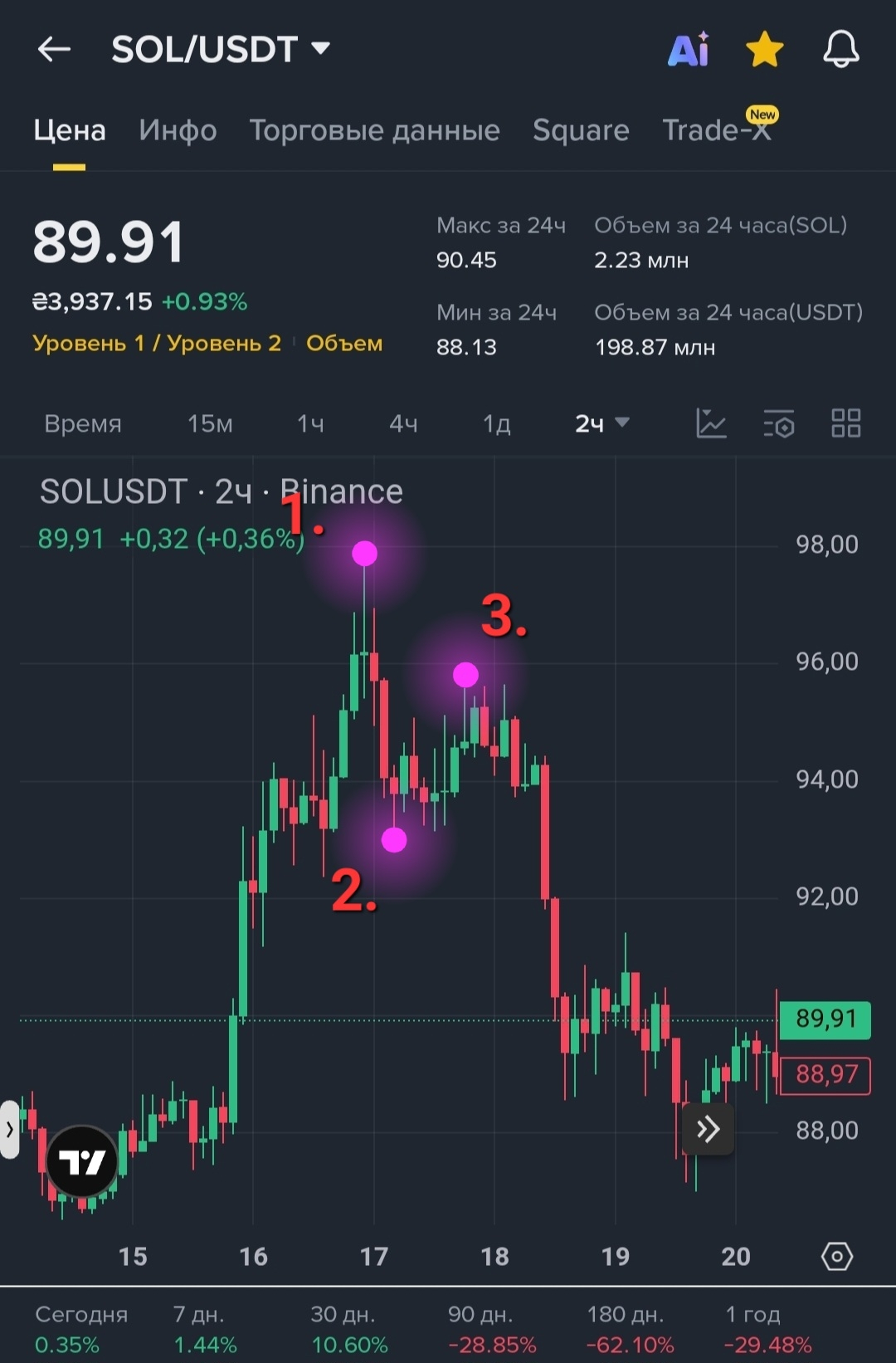 Точка 3: Неудачная попытка рынка вернуться к максимумам. Важно: цена НЕ обновляет точку 1. Это признак слабости.