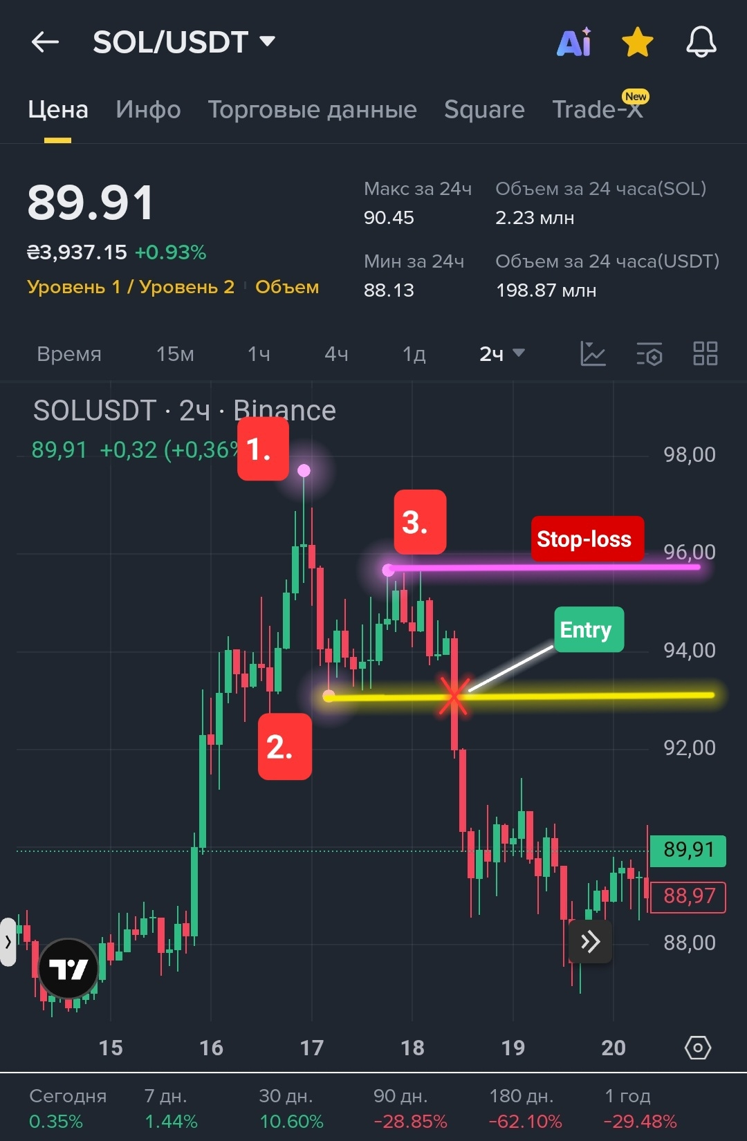 ➡️ Вход: На пробое горизонтального уровня Точки 2 (лучше дождаться закрытия свечи ниже уровня).