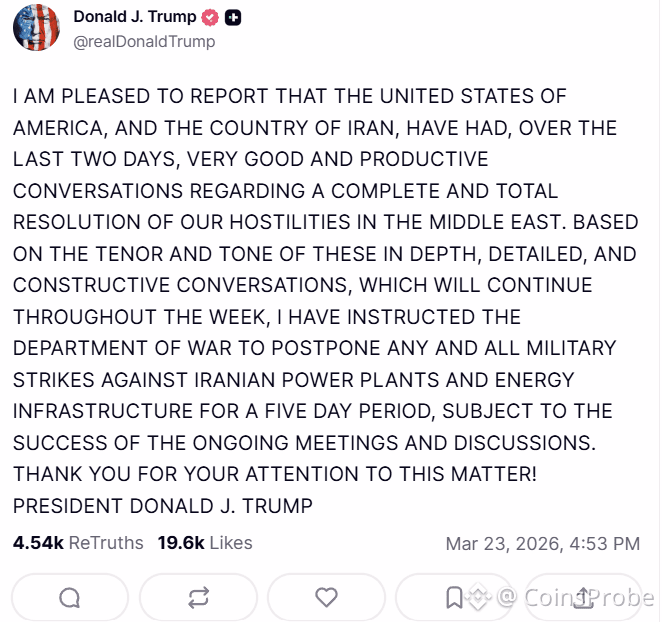 Trump went further — explicitly instructing the Department of Defense to postpone all military strikes on Iranian power plants and energy infrastructure for five days, citing the positive tone of ongoing talks that he said would continue throughout the week.