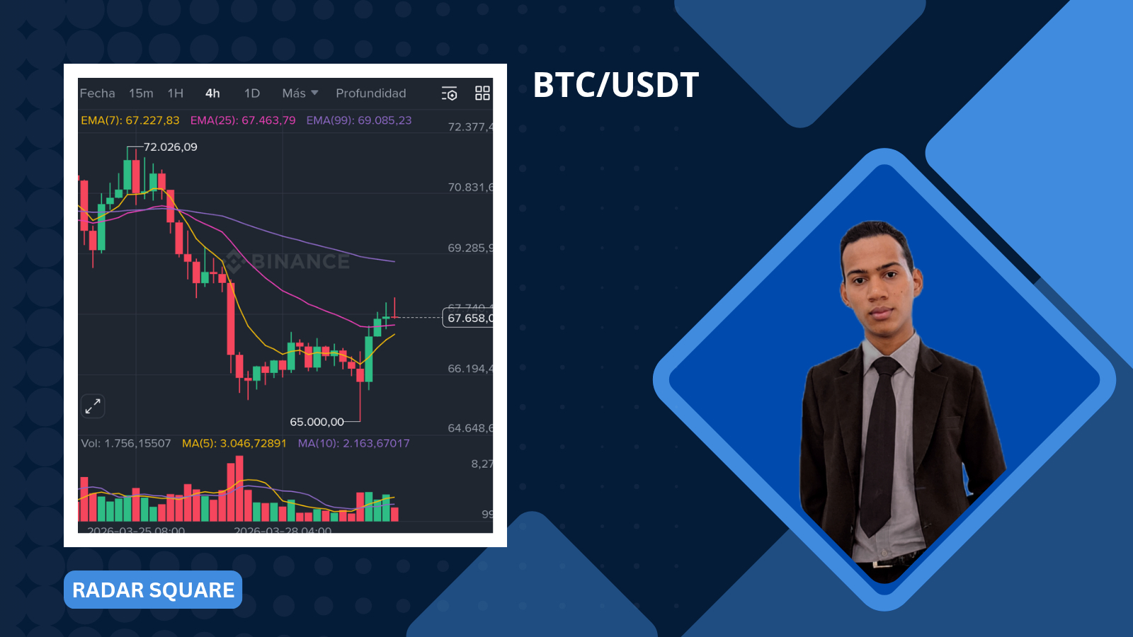 Resistencia Crítica: $69,085 (coincidente con la EMA de 99 periodos). Superar este nivel es vital para reanudar la tendencia alcista macro.