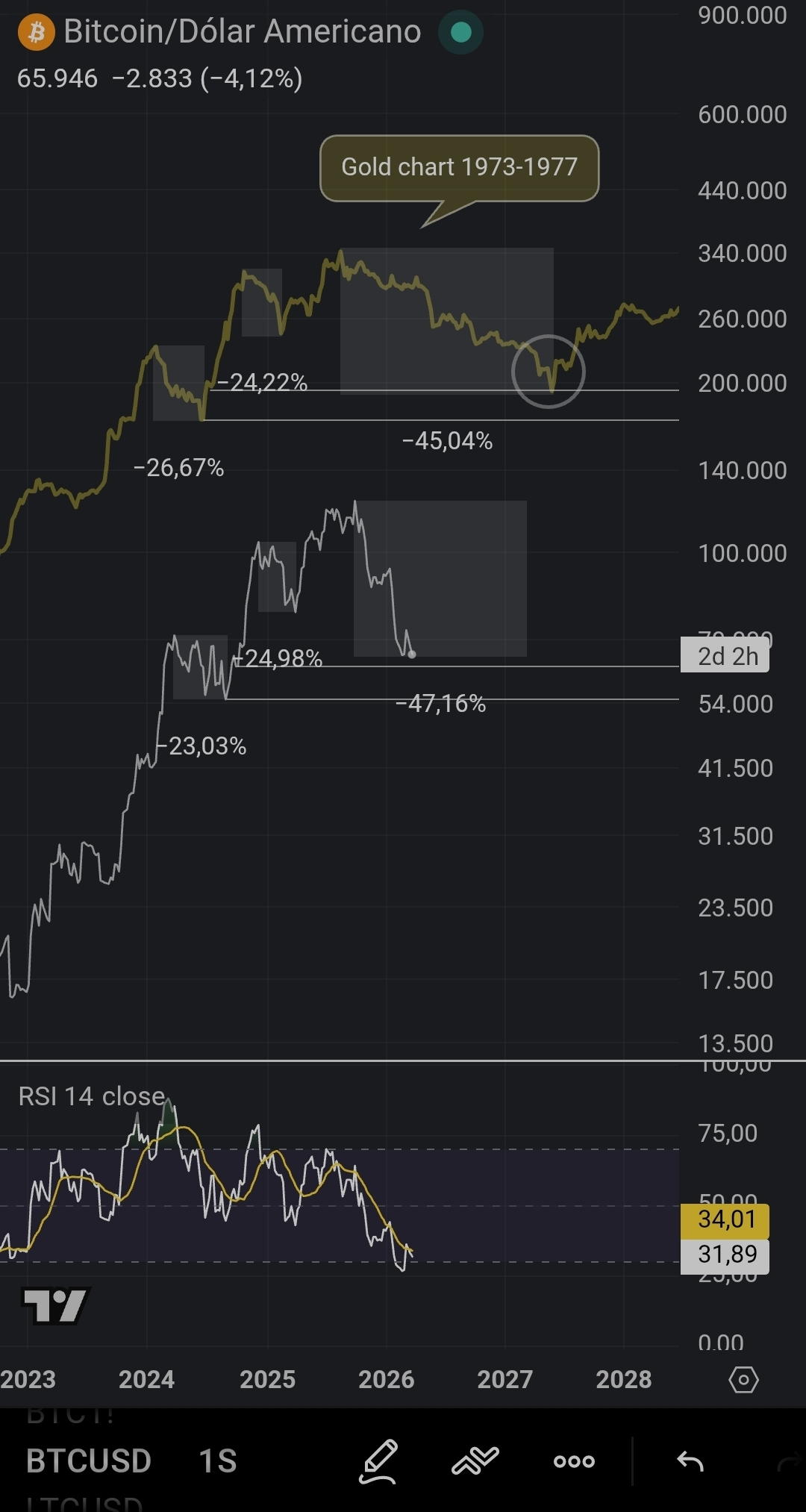 -Na drugim wykresie tego obrazu, Bitcoin jest w kolorze pomarańczowym, a Złoto w białym. Na zielono i czerwono znajduje się projekcja, którą zrobiłem dla spadku i odbicia dla Bitcoina (po prostu skopiowałem ruch Złota).
