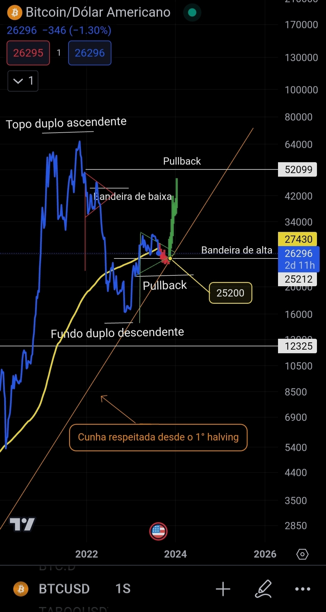 Po prostu dlatego, że zauważyłem, że ruch wzrostowy odzwierciedlał wzory Bearmarket w sposób odwrotny. Jak możecie zobaczyć, narysowałem ruch, gdy Bitcoin był na 26k, prawie kończąc ruch flagi.
