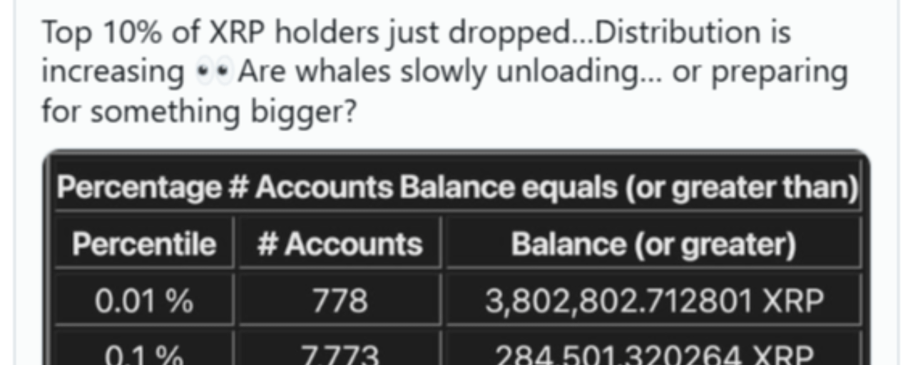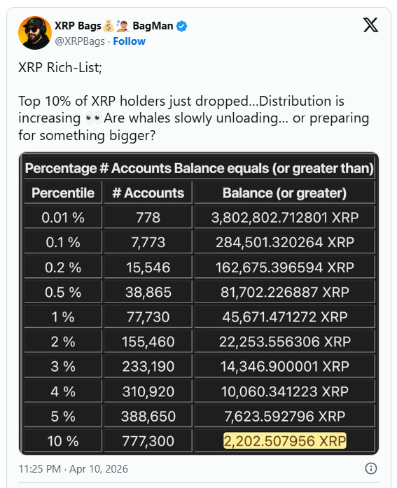 Najbardziej uderzająca zmiana pojawia się w dolnej granicy top 10%. Próg wejścia spadł, co wskazuje, że więcej portfeli obecnie kwalifikuje się do tej kategorii. Ten ruch sugeruje, że posiadanie XRP stopniowo rozprzestrzenia się wśród szerszej bazy uczestników.