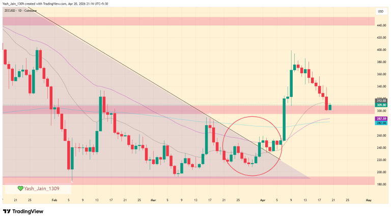 Mira, sprawa wygląda tak: ZEC w końcu przełamał ten zstępujący trójkąt, który dręczył nas od końca 2025 roku. To był silny ruch, który sprawił, że zaczęliśmy flirtować z $400, usypiając tę ciężką tendencję spadkową. Ale, jak wszystko w tym świecie kryptowalut, nic dobre nie przychodzi bez walki. Zamiast od razu lecieć na księżyc, cena wpadła w strefę wojny między $300 a $400. 🥊