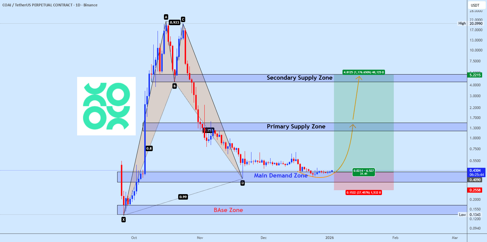 COAIUSDT wcześniej dostarczył wyjątkową paraboliczną ekspansję wynoszącą około 162x, po której nastąpiła ostra regresja średniej, która zatarła prawie 98% wzrostu. Po tym agresywnym spadku, akcja cenowa ustabilizowała się i przeszła w potencjalną fazę konsolidacji, sugerując, że rynek próbuję odbudować strukturę.