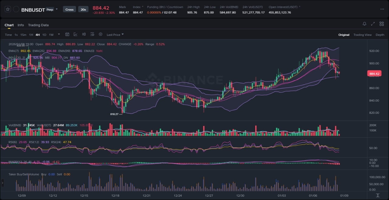 Obecna pozycja rynkowa BNB ujawnia token zmagający się z krótkoterminowym trendem spadkowym w szerszej fazie konsolidacji, co potwierdza jego ostatni spadek poniżej poziomu 885 $. Ogólna struktura sugeruje środowisko ograniczone w przedziale po wcześniejszym impulsywnym wzroście, który osiągnął szczyt blisko 950 $ pod koniec grudnia, teraz testując dolne granice w obliczu malejącego impetu byków. Analizując załączony wykres, który przedstawia 4-godzinny interwał czasowy, obserwujemy kilka kluczowych elementów: wyraźne odrzucenie na ostatnim swing high wokół 940 $, po którym nastąpił wzór konsolidacji przypominający opadający trójkąt oraz wzrost zmienności, gdy cena bada niższe kieszenie płynności w pobliżu 880 $. Eksponencjalne średnie kroczące (EMA) dostarczają dalszej klarowności — 7-okresowa EMA przecięła poniżej 25-okresowej EMA, sygnalizując niedźwiedzią zgodność, podczas gdy obydwie pozostają poniżej 99-okresowej EMA, potwierdzając dominację trendu spadkowego. Pasma Bollingera nieznacznie się kurczą po wzroście zmienności, a cena przylega do dolnego pasma, co wskazuje na potencjalną rewersję średniej, jeśli wsparcie się utrzyma, ale także zwiększone ryzyko załamania, jeśli presja sprzedażowa się nasili.