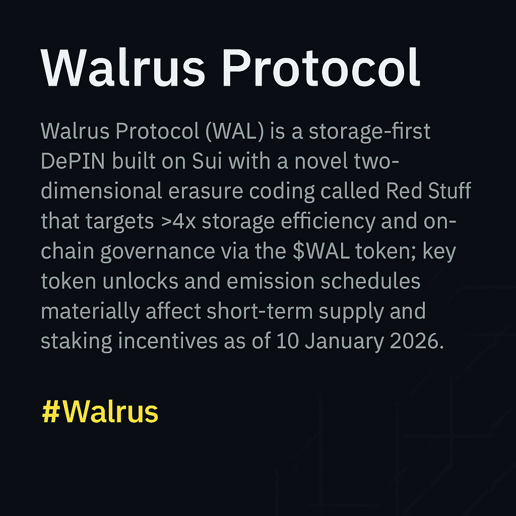Protokół Walrus (@walrusprotocol) pozycjonuje się jako optymalizowany pod kątem przechowywania DePIN oraz sieć stakingowa zgodna z Sui, z warstwą użyteczności tokena skupioną wokół $WAL . Analiza ta skupia się na podstawowej inżynierii protokołu, dynamice tokenów, ekonomice węzłów oraz mierzalnych wskaźnikach istotnych dla integratorów i posiadaczy tokenów. #Walrus