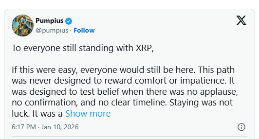 Post Pumpiusa przedstawia długoterminowe trzymanie XRP jako pozycję opartą na cierpliwości, długoterminowej przekonaniu i zaakceptowaniu opóźnionego jasności zamiast natychmiastowej nagrody.