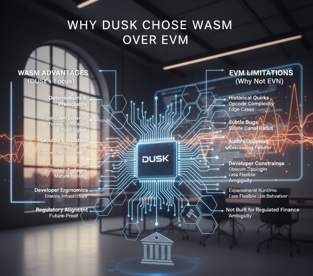 Wciąż pamiętam moment, gdy wybór w końcu do mnie dotarł. Porównywałem blockchainy, które twierdziły, że są „gotowe dla instytucji” i prawie wszystkie z nich mocno opierały się na EVM. Znane. Udowodnione. Wygodne. A jednak coś wydawało się nie tak. Kiedy przyjrzysz się dokładnie regulowanej finansie — prawdziwym papierom wartościowym, zasadom zgodności, przewidywalnym rozliczeniom — zdajesz sobie sprawę, że sama znajomość to za mało. Wtedy decyzja Dusk o zbudowaniu swojej podstawowej warstwy wykonawczej na WASM zamiast EVM zaczęła mieć głęboki, praktyczny sens.