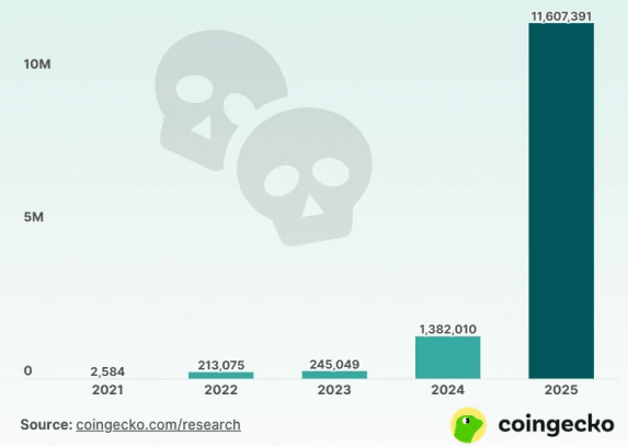Ponad połowa (53.2%) wszystkich projektów kryptowalutowych kiedykolwiek prezentowanych na GeckoTerminal przestała istnieć, przy czym ogromna większość „śmierci projektów kryptograficznych” miała miejsce w 2025 roku. W ciągu poprzedniego roku ponad 11.6 miliona tokenów „umarło”, co stanowi przytłaczającą większość (86.3%) całkowitej liczby „śmierci tokenów.”