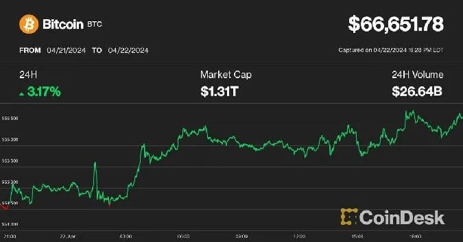 Bitcoin, którego nowa podaż spadła w weekend o połowę po raz pierwszy od czterech lat, wzrósł o ponad 3% w ciągu ostatnich 24 godzin i niedawno osiągnął cenę 66 500 dolarów. Ether (ETH) utrzymuje się w pobliżu poziomu 3200 dolarów, ale w tym samym okresie odnotował wolniejszy wzrost o 1,5%.