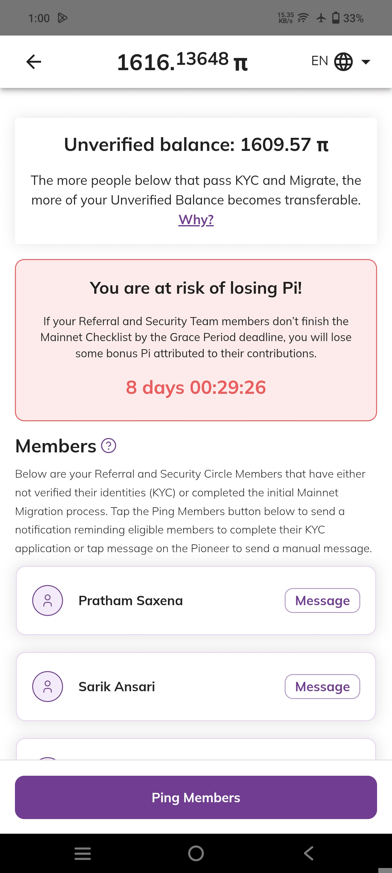 Uma vez que esta seção também consiste em "Pi bônus" de membros KYC'd em seu círculo de segurança/referências, essa é a razão pela qual existem pioneiros que não têm absolutamente nenhum membro não-KYC'd em seu círculo de segurança/referências, mas ainda assim veem saldo não verificado (é claro que há bônus de utilidade e bônus de nó também, mas uma parte maior vem do círculo de segurança e referências) em seu painel.