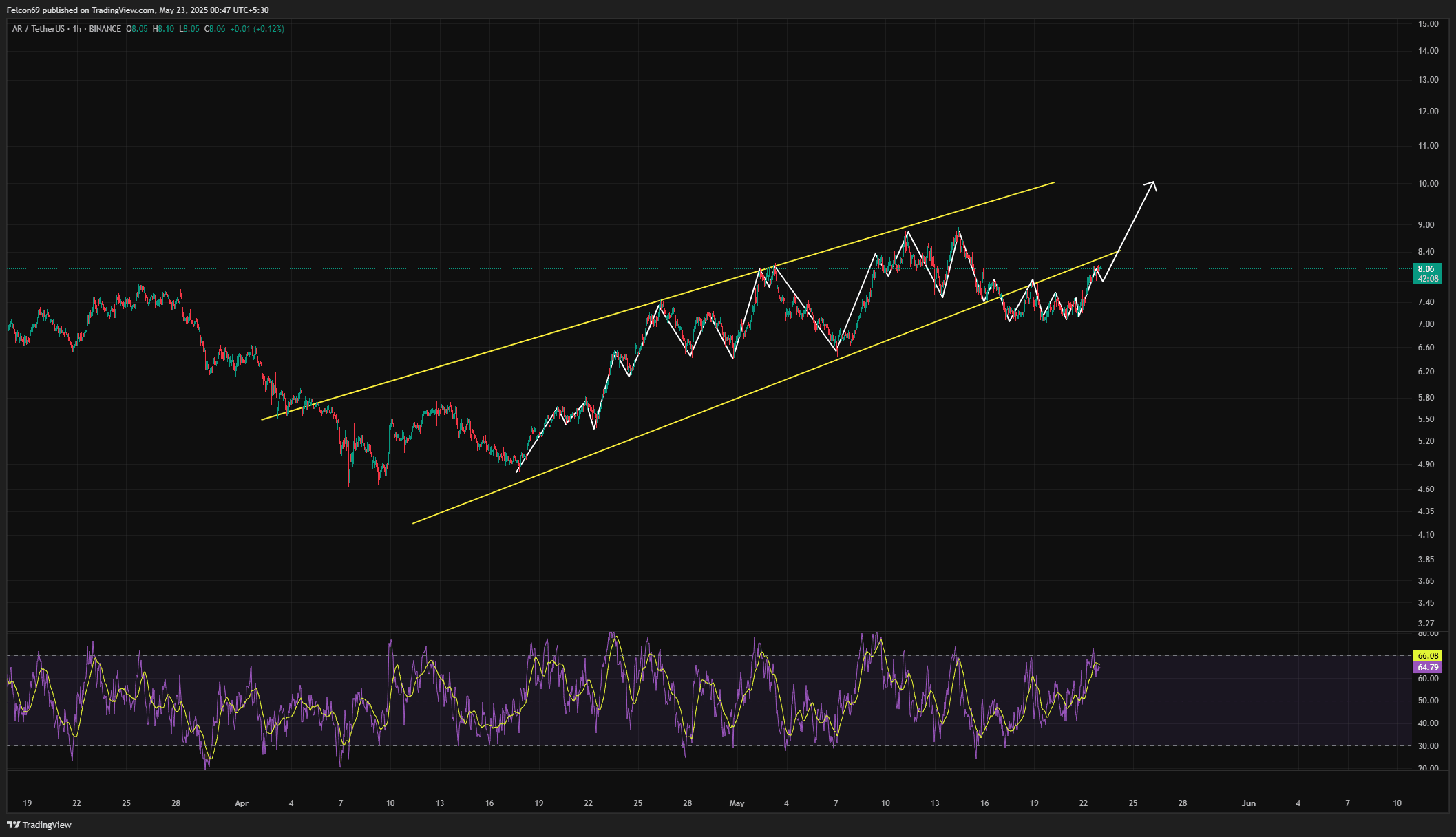 AR no gráfico de 1 hora, negociando dentro de um canal ascendente bem definido. A ação do preço está respeitando consistentemente as linhas de tendência superior e inferior, indicando uma tendência de alta estável. Atualmente, o preço está se recuperando da linha média do canal e se aproximando do limite superior perto de $8.80–$9.00, sugerindo uma continuação em direção à resistência. O RSI está em 66, tendência de alta, mas ainda não sobrecomprado, apoiando um potencial de alta adicional.