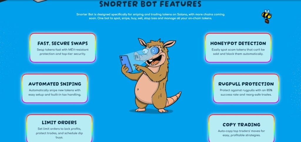 Posicionado como uma ferramenta para ajudar os traders a "farejar" o mercado de memes, o Snorter oferece recursos como baixas taxas na Solana, acesso exclusivo a novos tokens, execução rápida e proteções avançadas contra rug pulls, honeypots e outros riscos comuns de negociação.