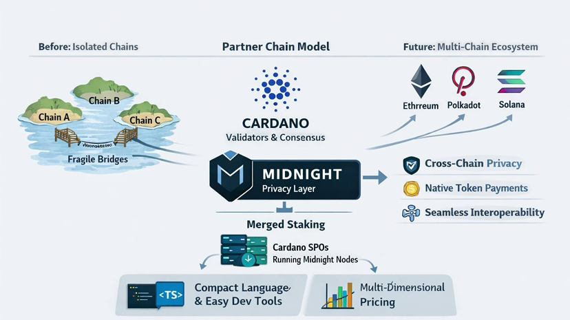 Pontes são uma dor de cabeça. Prometa uma cadeia, mint em outra e espere que o contrato não seja mal gerido. Todos nós já vimos como isso termina. O Midnight inverte esse modelo e fornece privacidade como um serviço. Recursos de privacidade não estão disponíveis apenas sem ter que migrar tudo para um sistema isolado. Outras cadeias podem se comunicar diretamente com o Midnight, pagar taxas usando seus tokens nativos e utilizar sua camada de privacidade.