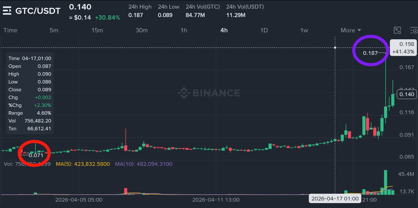 GTC exploded from $0.089 (24h low) to $0.187, now pulling back to $0.140. Volume hit 84.77M GTC ($11.29M USDT) – a 10x spike from the 30-day average. The 4H chart shows a long upper wick, indicating seller activity near $0.187. RSI is at 72 – overbought but not extreme. Support sits at $0.127 and $0.117. Resistance at $0.187 and $0.197.