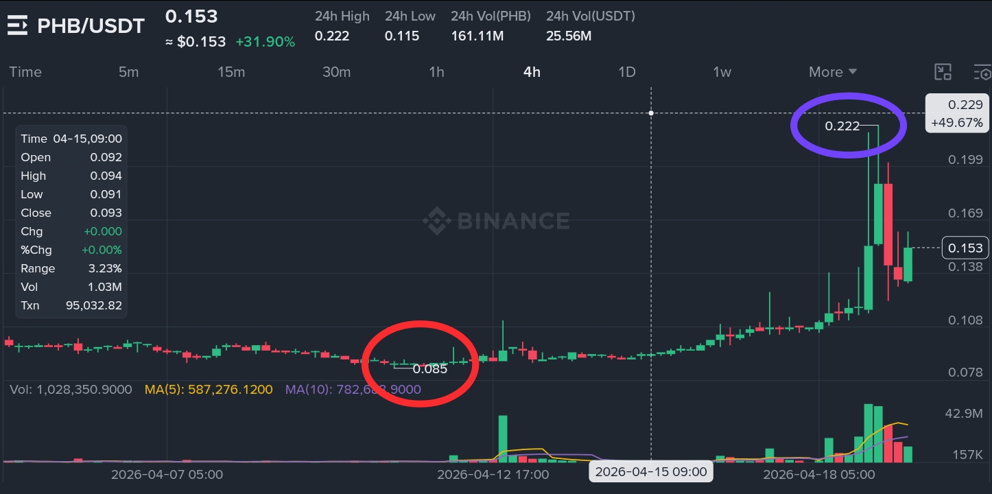 PHB (Phoenix) is an AI‑powered blockchain infrastructure project. The rally was fueled by two factors: first, Binance announced the addition of PHB to its “AI Innovation Zone” on April 16, giving it a visibility boost; second, the broader AI crypto sector (FET, AGIX, OCEAN) saw a relief rally. However, no fundamental upgrade or partnership was announced. The volume spike is real, but the rejection at $0.222 suggests sellers are active. On‑chain data shows no whale accumulation – the move appears retail‑driven.