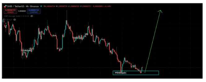 $SHIB o preço saltou de uma zona de acumulação destacada no gráfico de 4 horas, com o token sendo negociado perto de $0.00000723. O gráfico também mostra um caminho projetado para cima se o rebote se mantiver.