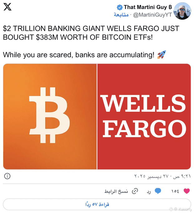 غالباً ما تدفع حالة عدم اليقين في الأسواق المستثمرين الأفراد إلى اتخاذ قرارات مدفوعة بالذعر. ومع ذلك، عادة ما تستجيب المؤسسات المالية الكبرى بطريقة مختلفة خلال دورات التقلب. وقد أطلقت Wells Fargo الآن إشارة قوية بشرائها صناديق بيتكوين بقيمة 383 مليون دولار. تعكس هذه الخطوة كيفية تعامل قادة التمويل التقليدي مع التعرض للعملات الرقمية بثقة طويلة الأجل. كما تعزز دور البيتكوين المتنامي داخل المحافظ الاستثمارية المنظمة.