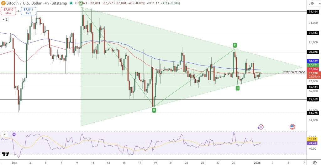 Despite the excitement in ETF flows, the price of Bitcoin itself remains in a “wait and see” mode. Currently hovering around $87,800, Bitcoin price prediction seems neutral right now. BTC is coiling up like a spring inside a symmetrical triangle pattern. This technical setup suggests the market is storing energy rather than breaking down.