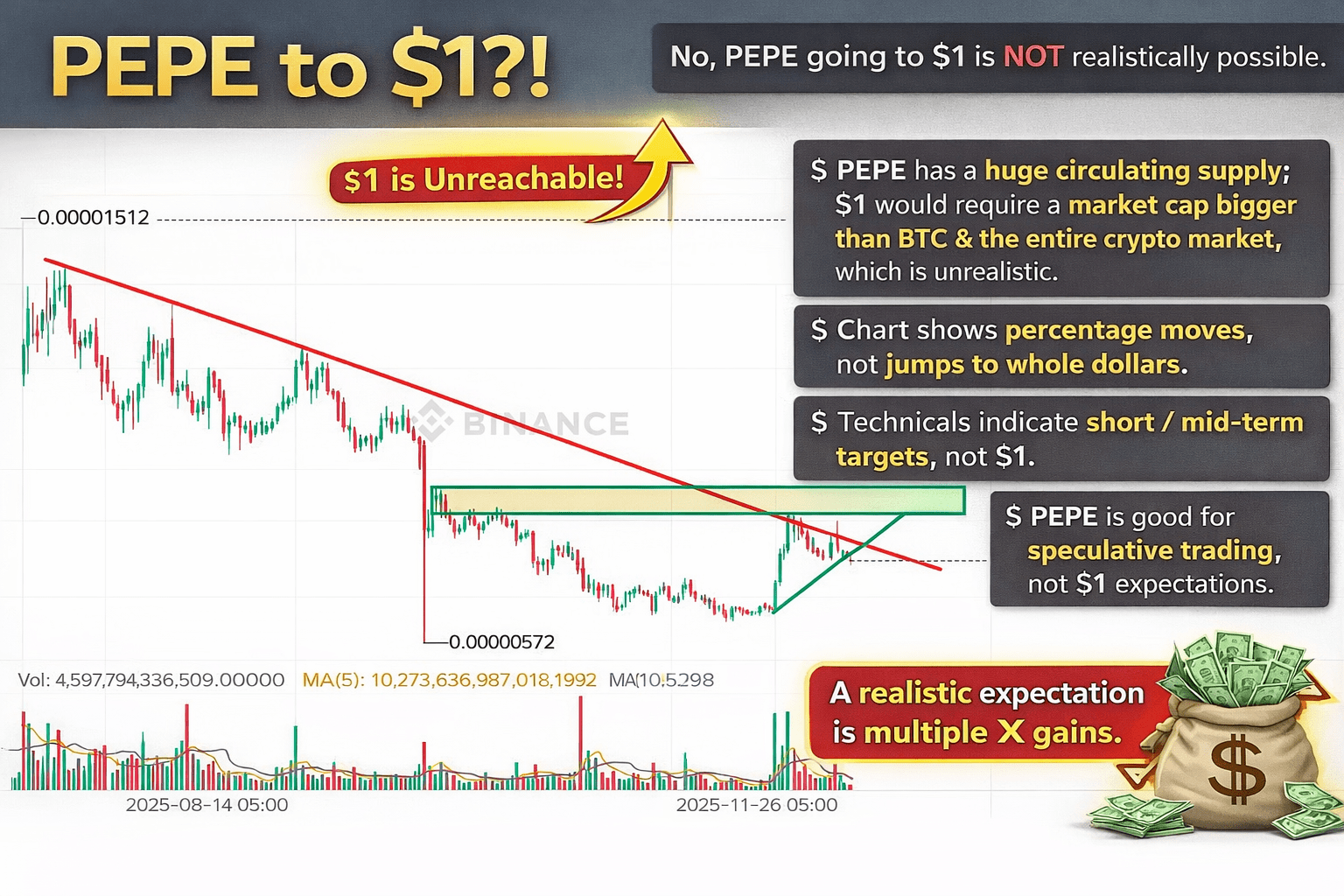PEPE é mais adequado para negociação especulativa e pequenas altas, não para uma avaliação de $1 a longo prazo.