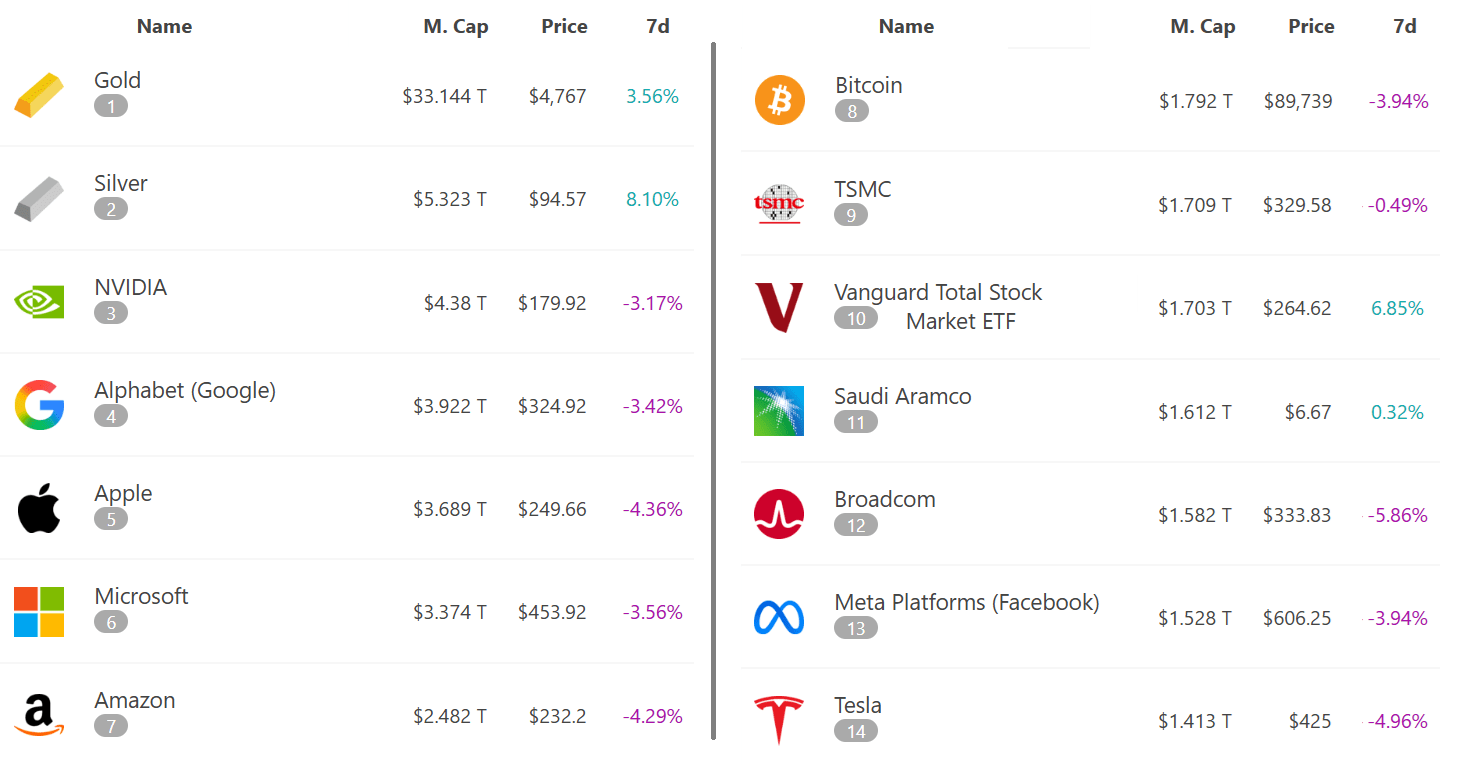 Capitalização de mercado de ativos comerciáveis globais de topo, USD. Fonte: 8marketcap