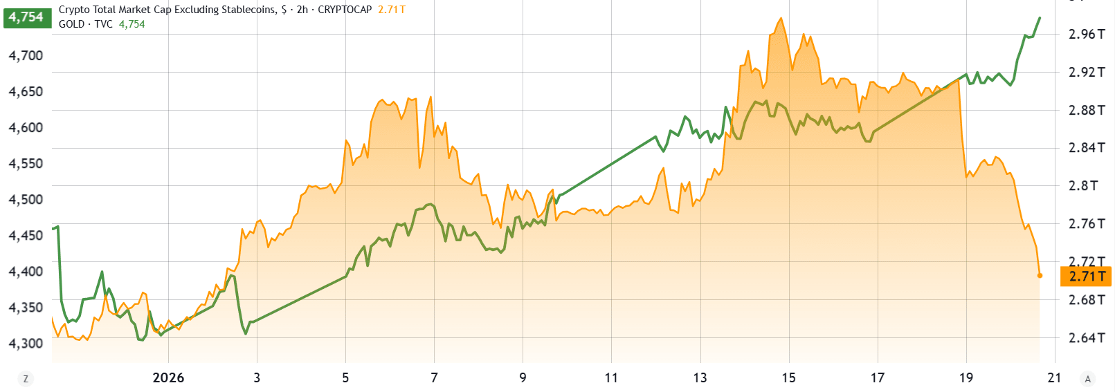 Ouro/USD (à esquerda) vs. Capitalização total de cripto/USD (à direita). Fonte: TradingView.com
