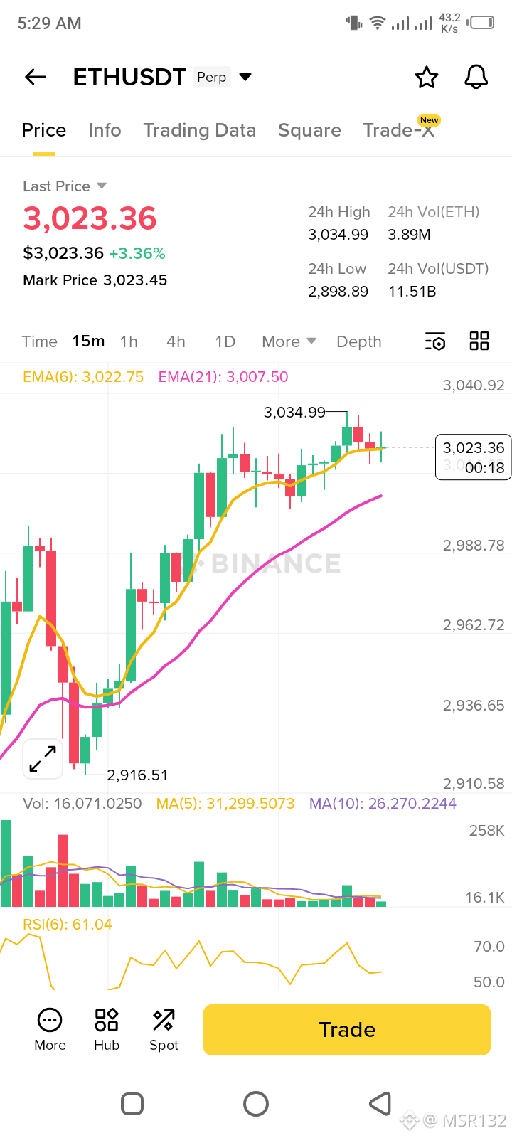 * Consolidation: The current candle shows some minor rejection at $3,034, suggesting a brief consolidation before the next leg up.