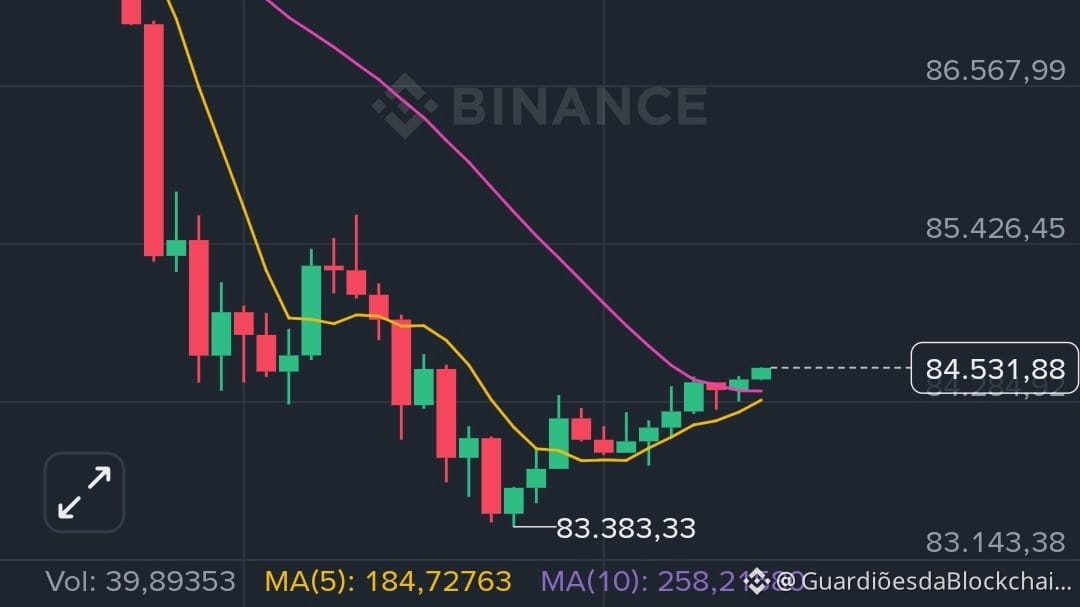 $BTC Hoje, o gráfico BTC/USDT na Binance revela um cenário de forte correção no mercado. O preço atual do Bitcoin está em US$ 84.531,88, com uma queda de -5,44% nas últimas 24h. Em reais, isso representa R$ 439.565,77 — um recuo expressivo que acende alertas e oportunidades.