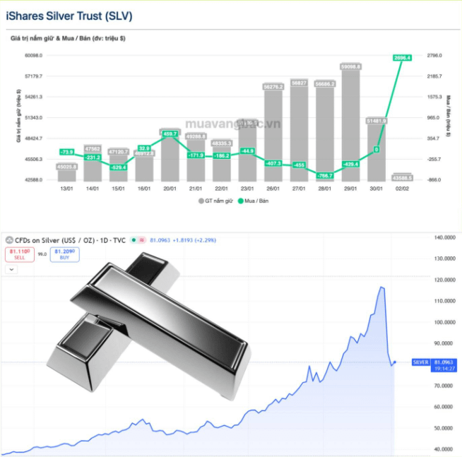 No dia 2/2, o iShares Silver Trust (SLV) – o maior fundo de prata do mundo – injetou quase 3 bilhões de dólares no mercado em apenas 1 dia, equivalente a cerca de 500 toneladas de prata.
