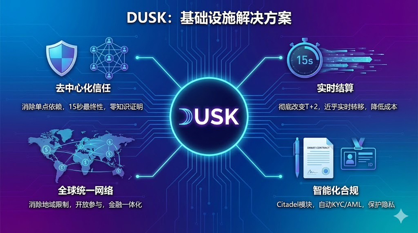 Vantagens revolucionárias da confiança descentralizada A DUSK descentraliza o mecanismo de confiança, eliminando a dependência de uma única instituição. A finalização em 15 segundos garante a certeza da transação, provas de conhecimento zero asseguram a proteção da privacidade e contratos inteligentes garantem a execução automática.