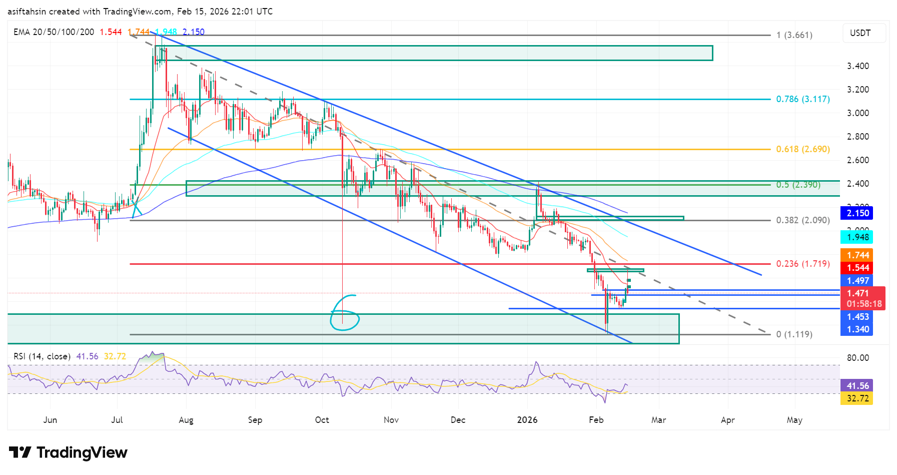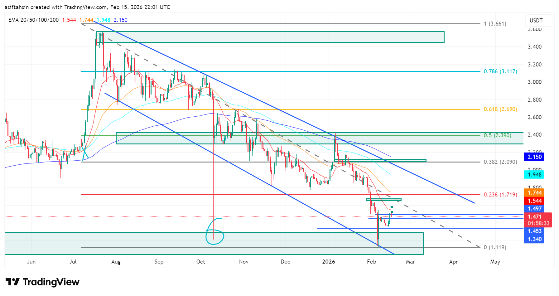 The 1.74–2.15 zone (50–200 EMA cluster) now acts as strong dynamic resistance.