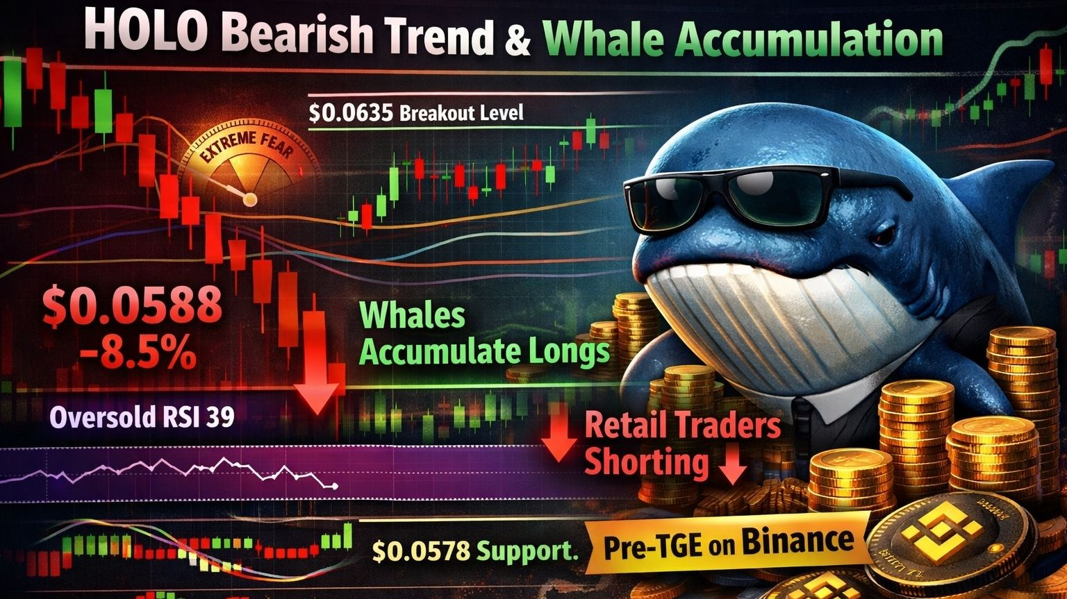Piața pentru $HOLO arată în prezent un amestec fascinant de acțiune de preț bearish și poziționare bullish potențială din partea banilor inteligenți. Deși graficul pe termen scurt arată slab, comportamentul balenelor sugerează că o posibilă inversare sau o strângere scurtă ar putea fi în curs de desfășurare în fundal.