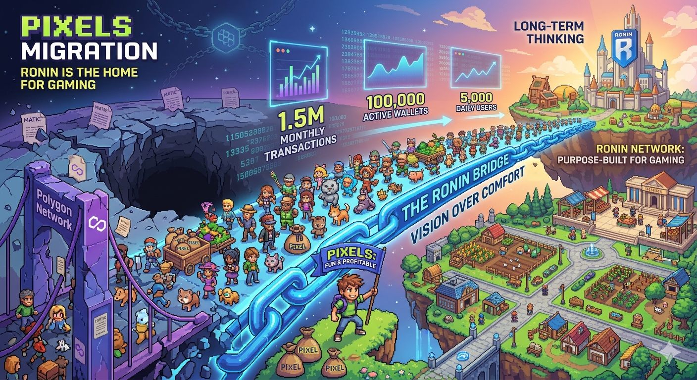 When Pixels left Polygon for Ronin, most people shrugged. New chain, cheaper fees, cool. But I looked at it from a different angle. Pixels moved 1.5 million monthly transactions, 100,000 active wallets, and 5,000 daily users to Ronin. That's a lot of activity to pick up and relocate. You don't do that for slightly cheaper gas. You do that because the new home fits your vision better. Ronin was purpose-built for gaming with high throughput and low fees that handle heavy player traffic without breaking. I've watched projects sit on chains that don't match their needs for years because switching is scary. Pixels switched anyway. That told me the team thinks long-term, not comfortable.