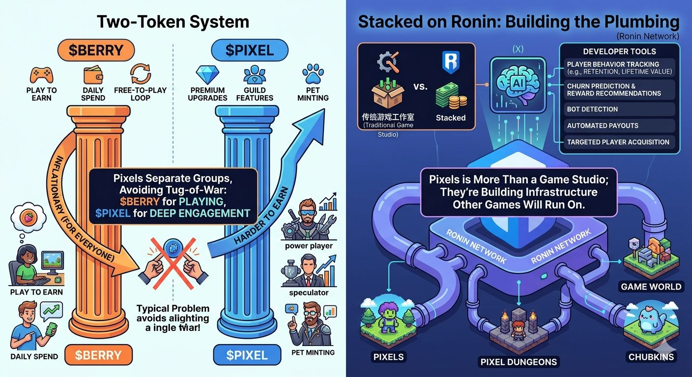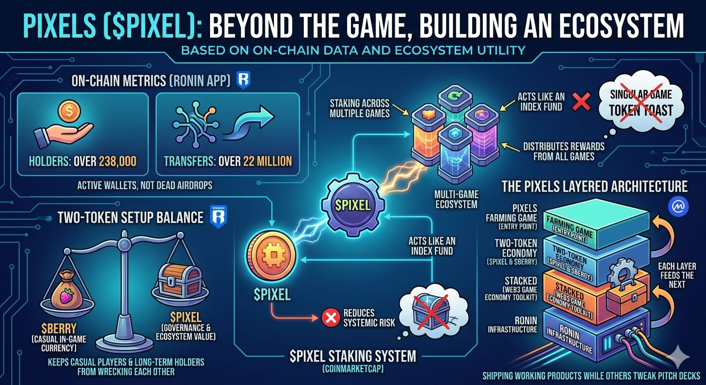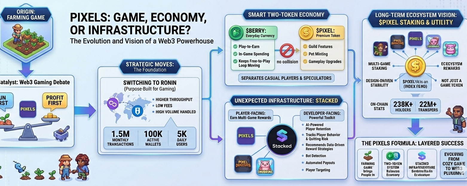 Going back to that argument with my friend. After everything I've seen over the past few months, here's where I landed. Pixels is a game. It's also an economy. But what it's becoming is the toolkit other Web3 games need to build their own economies. The farming game brings people in. The two-token setup keeps casual players and long-term holders from wrecking each other. Stacked gives the whole Ronin ecosystem infrastructure that didn't exist before.