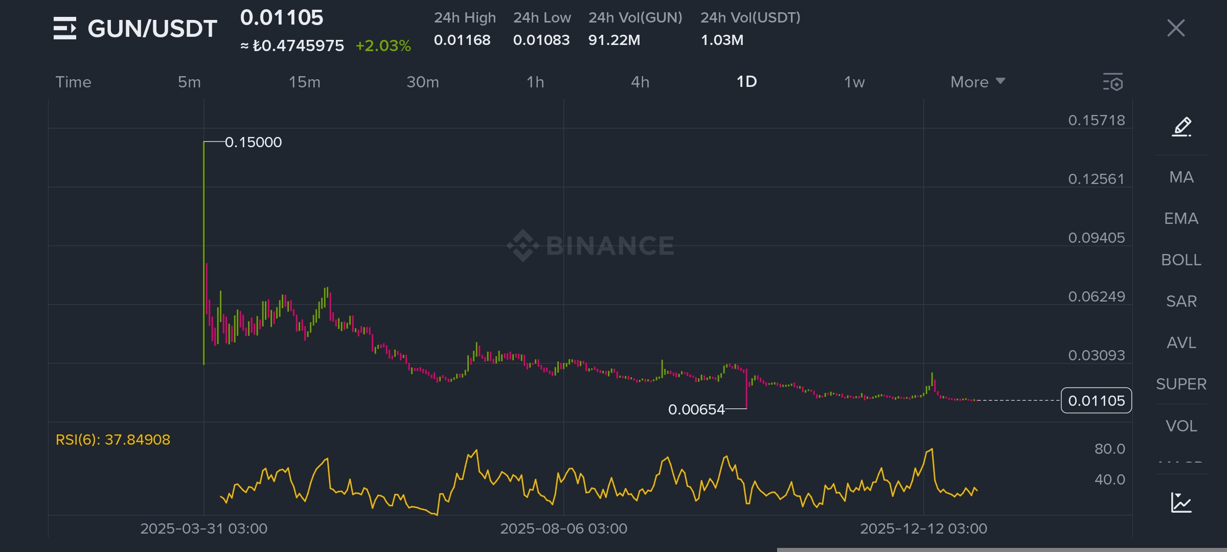 GUNZ (GUN) este o criptomonedă lansată pe 31 martie 2025, cu o ofertă totală de 10 miliarde de tokenuri și o ofertă circulantă de 1,47 miliarde. Începând cu 31 decembrie 2025, tokenul se tranzacționează la 0,01108385 USD, reflectând o creștere de +2,39% pe parcursul a 24 de ore, dar o scădere de -6,90% în ultimele 30 de zile. Acest raport sintetizează indicatorii tehnici, sentimentul pieței și datele on-chain pentru a oferi o predicție de preț și informații acționabile.