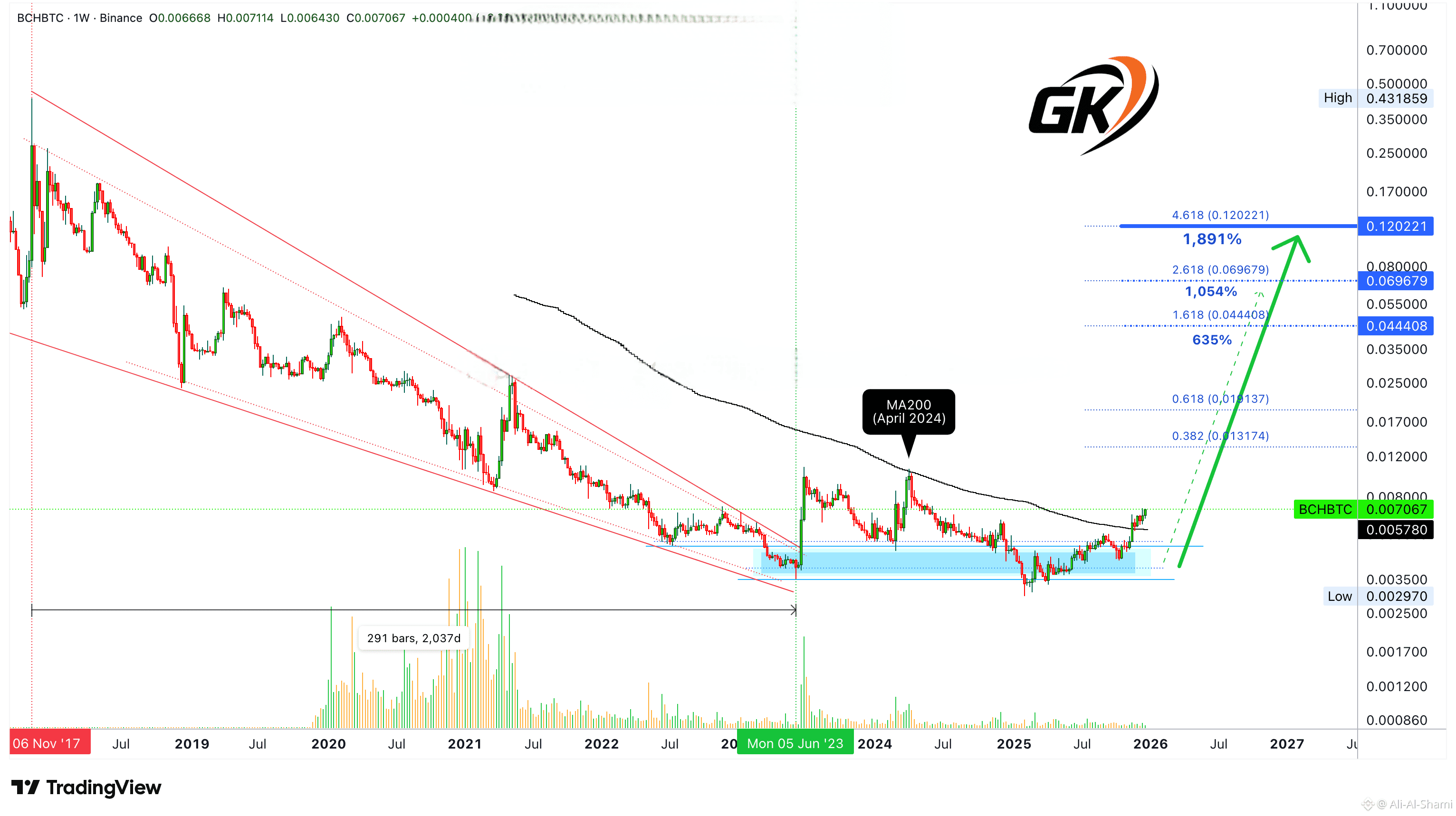 لقد تم استيعاب MA200 كمقاومة وأصبح الآن شيئًا من الماضي. إذا تحركت الأسعار للأسفل لأي سبب كان، فهذا هو الدعم الرئيسي الآن. ولكن، لا يوجد انخفاض. BCHBTC حقًا في حالة صعود مع وجود شمعة تتداول في أعلى الجلسة بينما تقترب الأسبوع من نهايته. هذا يخبرنا أننا سنشهد حركة صعود قوية تبدأ الأسبوع المقبل.