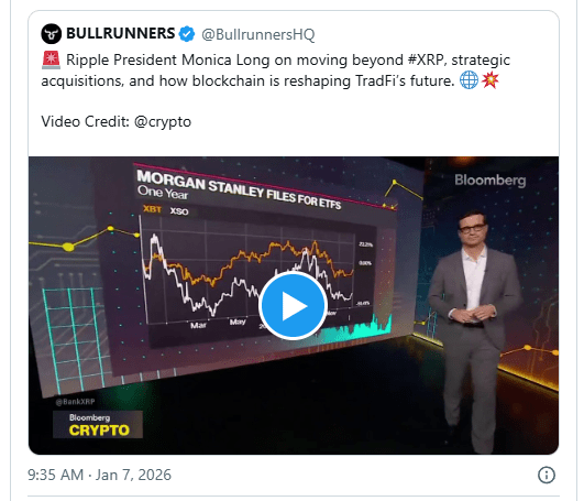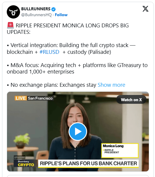 $XRP Fundatorul BullRunners, Nick Anderson, a atrăs atenția recent asupra actualizărilor strategice partajate de președintele Ripple, Monica Long, care arată cum compania se poziționează pentru următoarea fază de adoptare instituțională în domeniul activelor digitale.