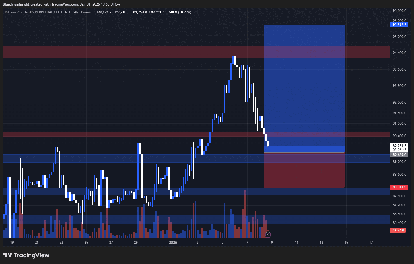 după eșecul menținerii nivelului deasupra zonei 94k–95k, a scăzut$BTC la zona 89k–90k, care se potrivește perfect cu zona principală de cerere din intervalul H4.
