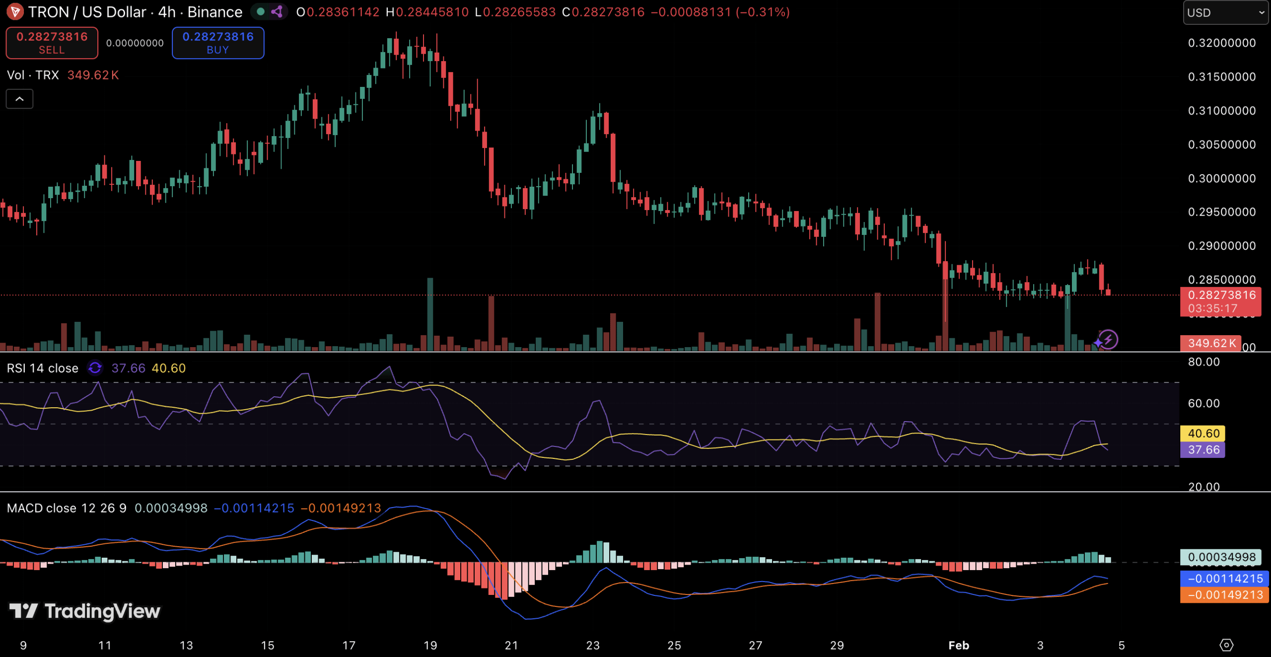 Anunțul vine în condițiile în care TRX se tranzacționează în jurul nivelului de 0,28 USD pe Binance, după o corecție mai largă a pieței. Pe graficul de 4 ore, TRX s-a mișcat lateral după o perioadă de declin, cu indicatori de momentum care arată condiții atenuate și o convingere limitată a creșterii pe termen scurt.