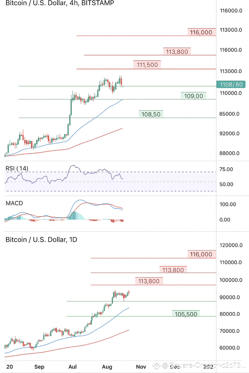 الاتجاه العام لا يزال صاعد، لكن تظهر إشارات على تباطؤ الزخم مع دخول السعر في نطاق تذبذب بين 109,000 $ إلى 112,000 $، وهي منطقة تجميع قصيرة المدى قبل اتخاذ الاتجاه القادم