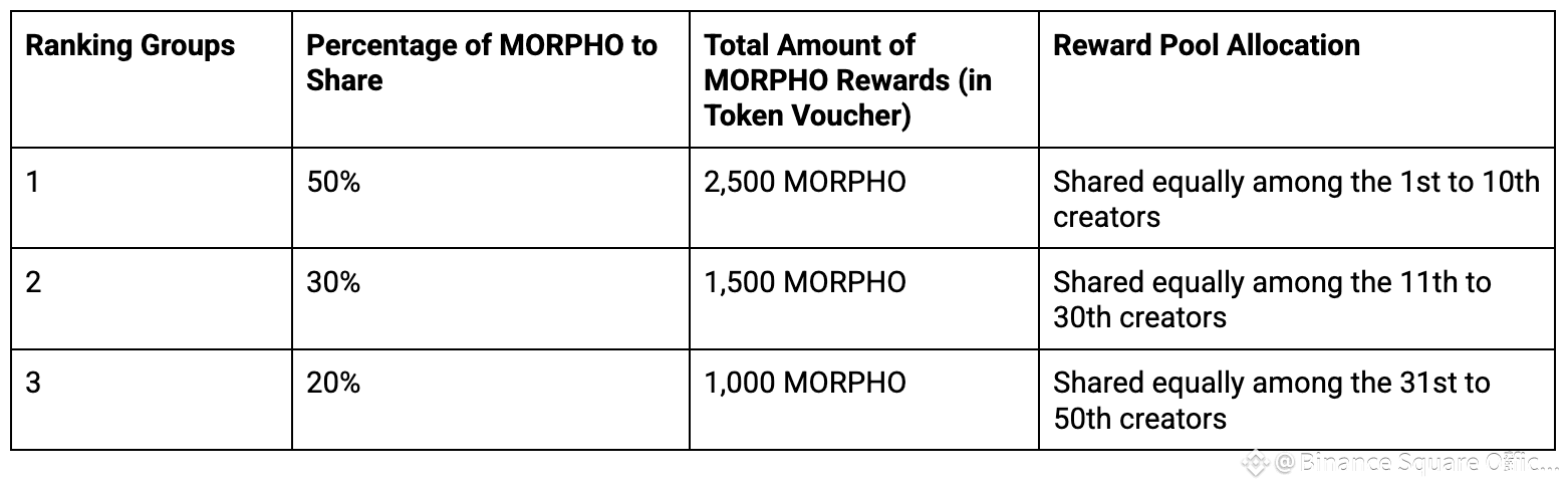The top 50 creators will be eligible for this additional 5,000 MORPHO prize pool. This reward is based on the 7-day rankings at the Activity launch date on the Square Creator Leaderboard. The 5,000 MORPHO will be split into three ranking groups, as per the table below: