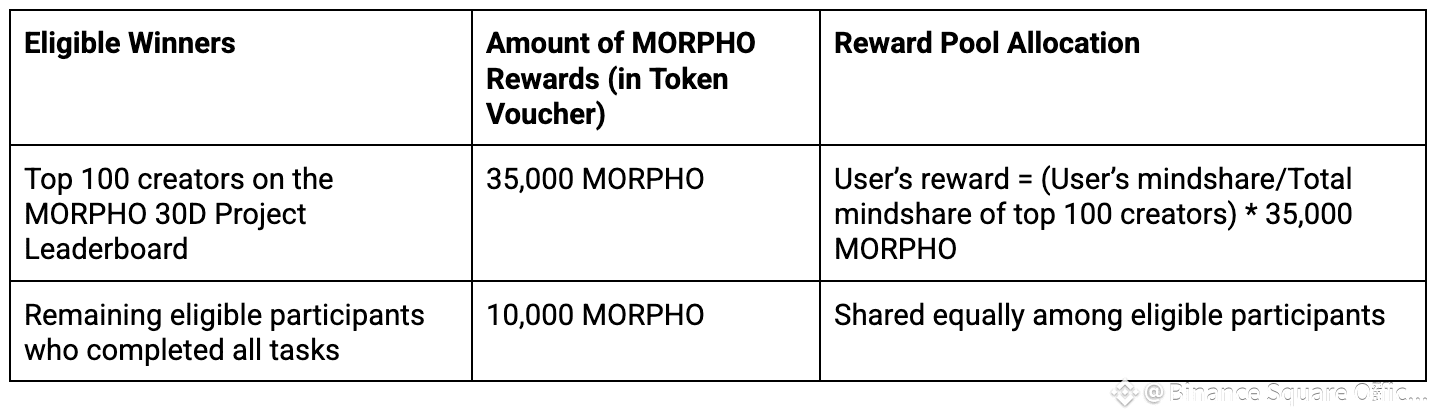All verified Binance users can complete the following tasks to unlock a share of 45,000 MORPHO in token vouchers. In addition, 5,000 MORPHO token vouchers will be allocated to the top 50 creators on the Square Creator Leaderboard based on the 7-day rankings at the Activity launch date.